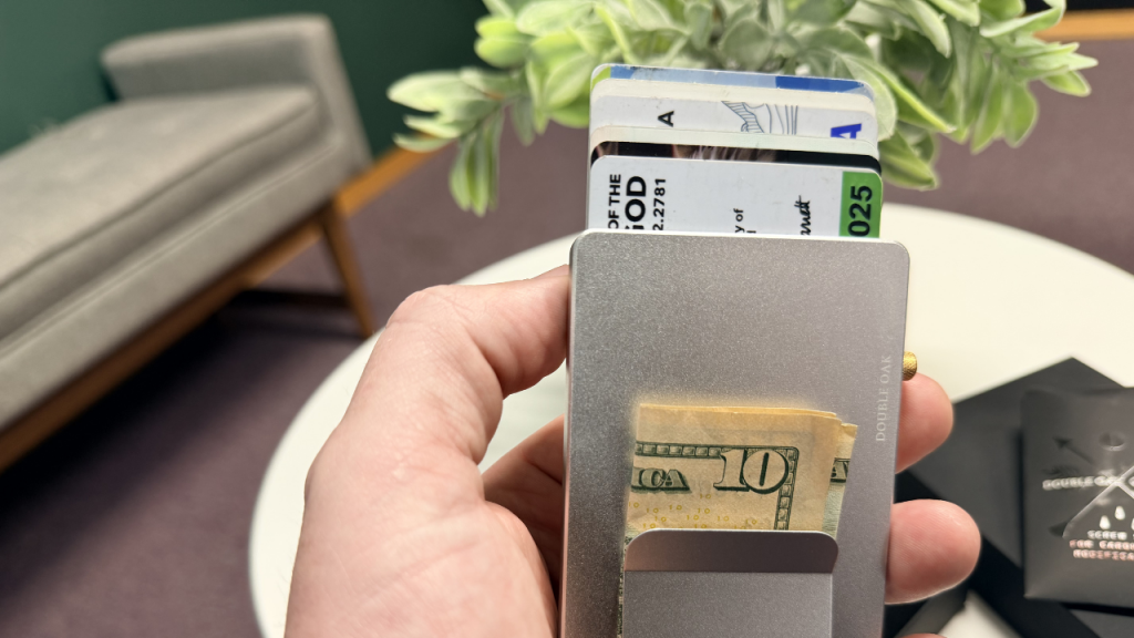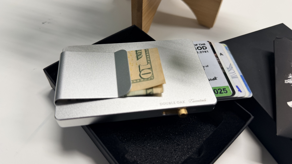 I’m using the silver with gold pop-up card holder (Paid Link), which was gifted to me by Double Oak Essentials. Although it was a gift, I’m going to give you my full, complete, and honest review. I’ll let you know what I like and do not like, how it worked for me, how it held up, and whether or not it may be a good wallet for you.