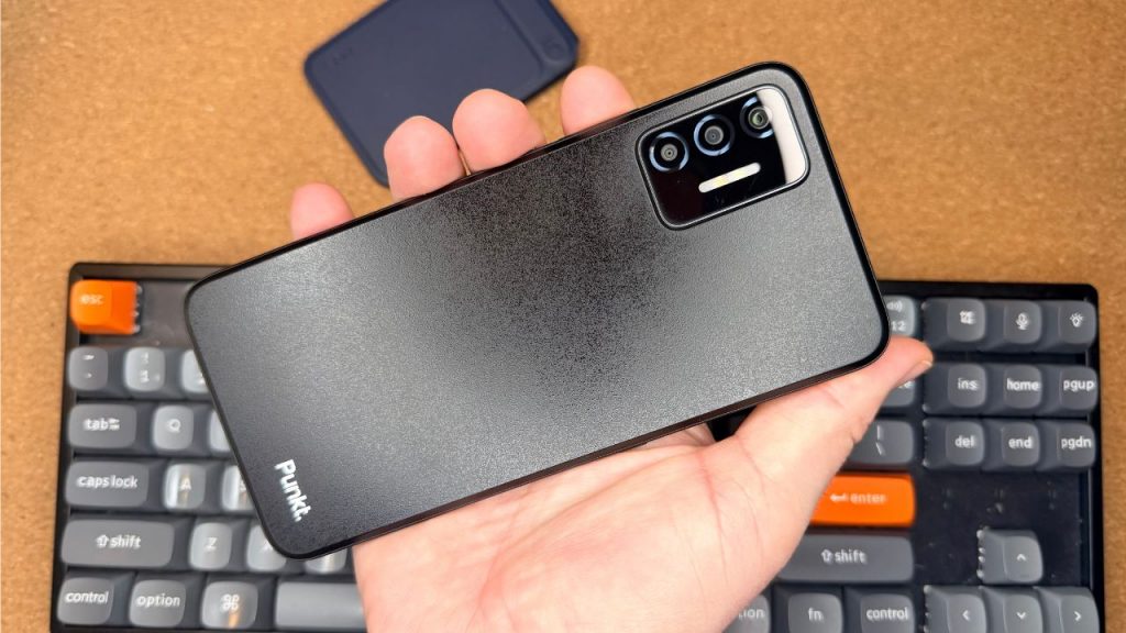 The rear of the phone has a textured plastic design, with its triple cameras stacked on top of each other in the top left of the back. The off-center Punkt logo sits directly opposite on the bottom right.