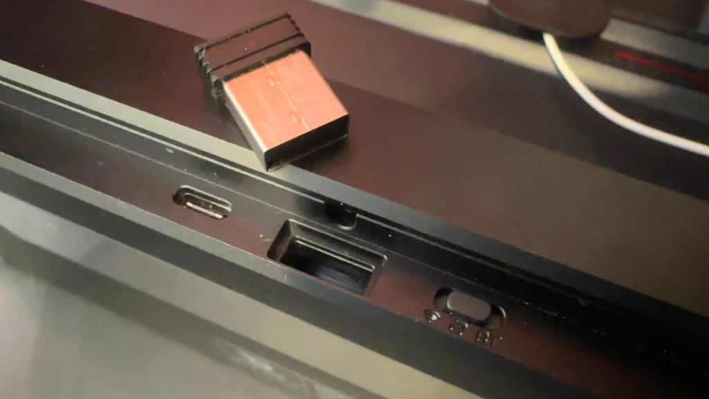 The connectivity is actually quite good with 3 Bluetooth connections, a wired connection, and 2.4 GHz wireless. I primarily use Bluetooth connections, and the wake-up to typing time is very low, even compared to some Bluetooth-only connecting keyboards, which is good, seeing as how the sleep timer on this keyboard is very, very short (we’ll talk about that in a moment). It also features a magnetic holder in the front of the case to hold the 2.4 GHz receiver, so it does not get lost. This is a feature that similarly priced keyboards would never dream of having.